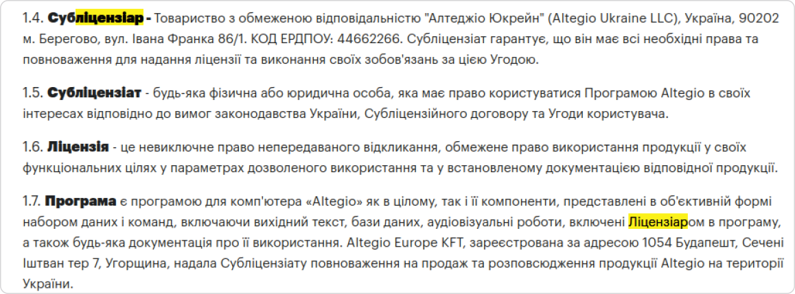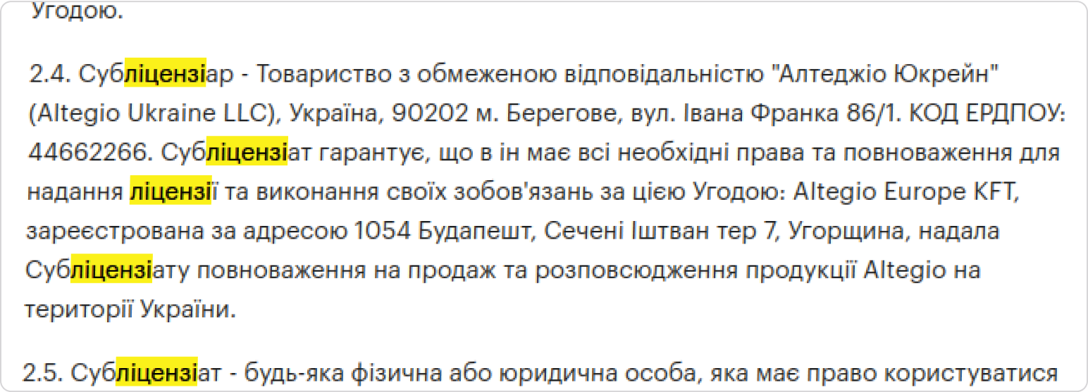 Тримачем ліцензії (Ліцензіаром) на програму є угорський AltegioEurope KFT. Жодних договорів з цього приводу в цих офісах не надають. В договорі оферті на сайті ALTEGIO конкретних власників вказаних фірм не зазначено. Хто, кому і на яких умовах передав не вказано.